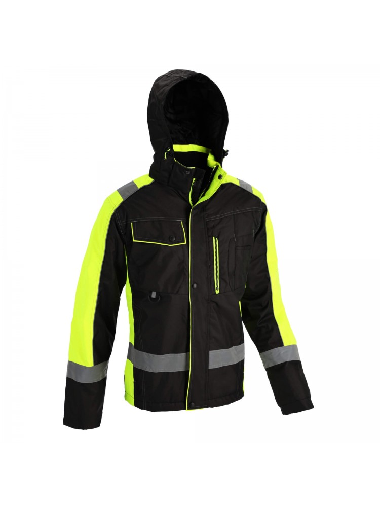 Kurtka ocieplana ALPHA wykonana z wodoodpornego materiału OXFORD (100% poliester impregnowany wewnętrznie PU). Zasuwana na zamek błyskawiczny osłonięty listwą na napy. Wiele funkcjonalnych kieszeni w tym kieszenie zewnętrzne: na klatce piersiowej zapinane na zamek oraz na napy, kieszonki na przybory, dwie dolne kieszenie wsuwane zapinane na zamek oraz kieszenie wewnętrzne: kieszeń siatkowa na akcesoria zimowe, kieszeń na smartfon zapinana na rzep oraz kieszeń piersiowa wewnętrzna na zamek. Taśma odblaskowa na korpusie i rękawach zwiększająca widoczność. Odpinany ocieplany kaptur z elementami odblaskowymi, ze ściągającymi gumkami i stoperami dla pełnej regulacji i najlepszego dopasowania. Wysoki kołnierz chroniący przed wiatrem z wewnętrznym miękkim polarowym obszyciem. Mankiety zakończone miękkim wewnętrznym ściągaczem. Pikowana poliestrowa podszewka. Nieprzemakalne szwy uszczelnione taśmą. EN ISO 13688:2013 Rozmiary od S-XXXL. Kolory: Czarna/Żółta HV
