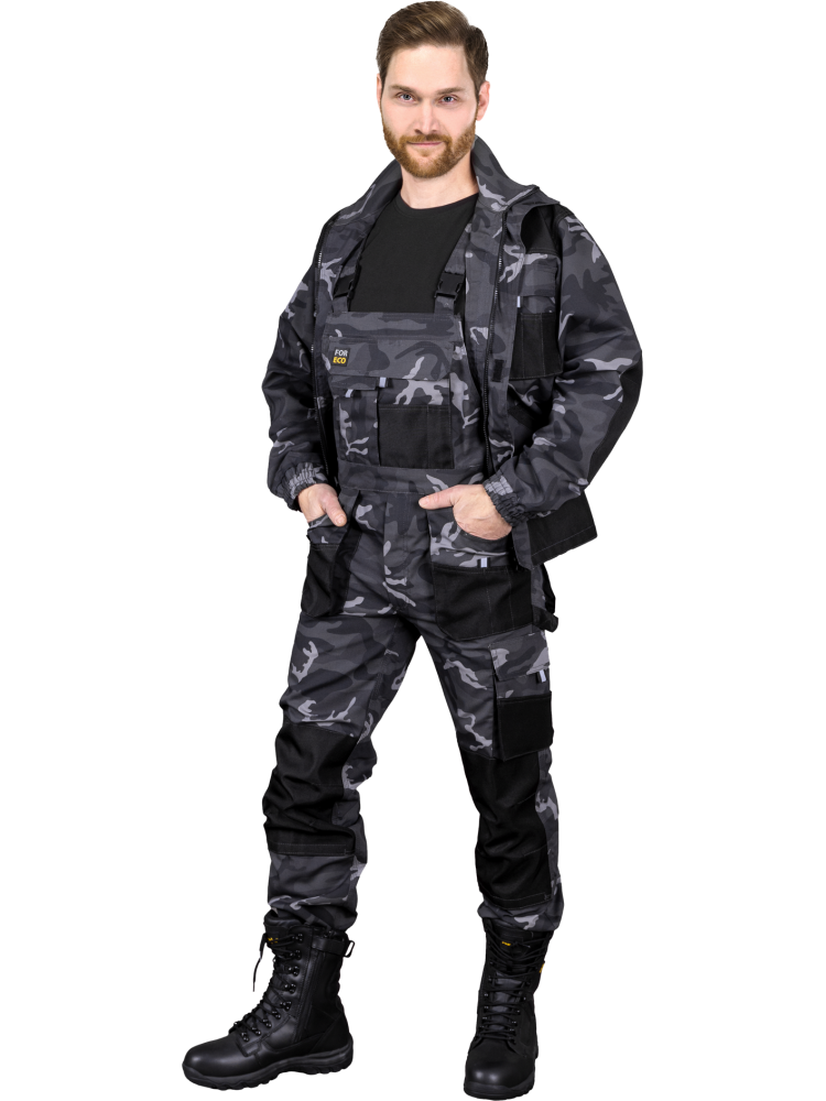 Spodnie robocze Foreco-B ogrodniczki w modnym kolorze moro. Idealne spodnie do pracy posiadające liczne kieszenie mieszczące najpotrzebniejsze przybory. Spodnie ochronne posiadają miejsce na wkładki nakolannikowe.