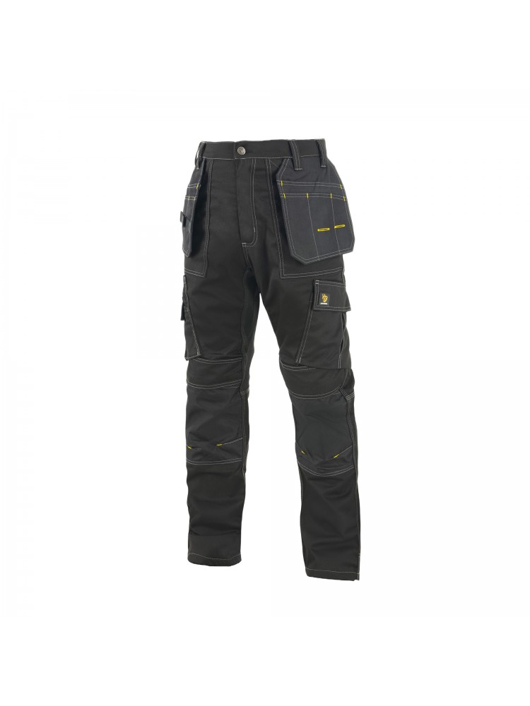 Spodnie robocze BUILDER wykonane z trwałej, wysokiej jakości tkaniny w składzie bawełna 35% i poliester 65% o gramaturze 310 g/m² o nowoczesnym fasonie. Spodnie posiadają wiele funkcjonalnych kieszeni w tym kieszeń na smartphone, kieszenie przednie, kieszenie tylne kryte patką na rzep, kieszeń typu bojówka, taśma do zawieszenia narzędzi typu młotek itp. Dzięki wzmocnieniom z materiału zabezpieczającego są odporne na przetarcia. Rygle wzmacniające i potrójne szwy zwiększają wytrzymałość. Każda para spodni pakowana w osobne opakowanie z zawieszką.