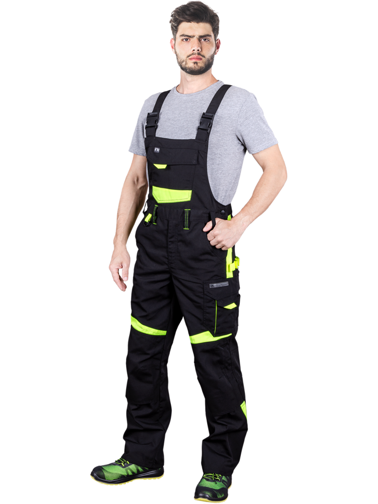Spodnie ogrodniczki męskie w kolorze czarno-żółtym marki Leber&Hollman. Spodnie robocze posiadają dużą ilość praktycznych kieszeni. Szelki umożliwiają regulację długości. Gumy wszyte w pasie pozwalają na regulację tęgości, dzięki czemu spodnie lepiej dopasowują się do sylwetki. Tkanina: 65% poliester, 35% bawełna o gramaturze 270 g/m² . Wstawki z kontrastowego materiału 65% poliester, 35% bawełna o gramaturze 195 g/m² .