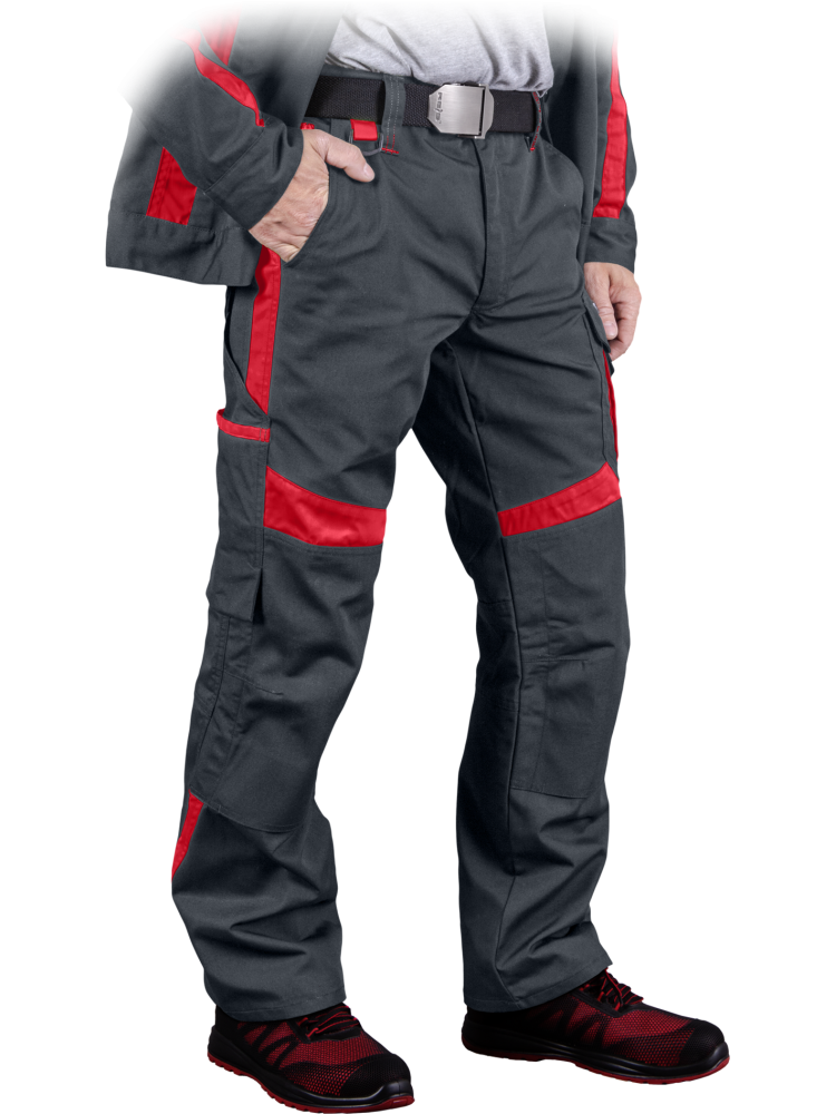 Spodnie do pasa męskie w kolorze antracytowo-czerwonym marki Leber&Hollman. Spodnie robocze posiadają dużą ilość praktycznych kieszeni. Tkanina: 65% poliester, 35% bawełna o gramaturze 270 g/m² . Wstawki z kontrastowego materiału 65% poliester, 35% bawełna o gramaturze 195 g/m²